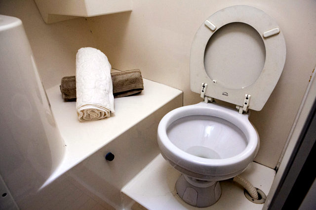 Uma grande cama de casal a proa, um sofá a BB que pode servir como cama de solteiro, uma bancada para geladeira e micro-onda são completados por um banheiro fechado munido de pia, WC e um pé direito de 185cm.