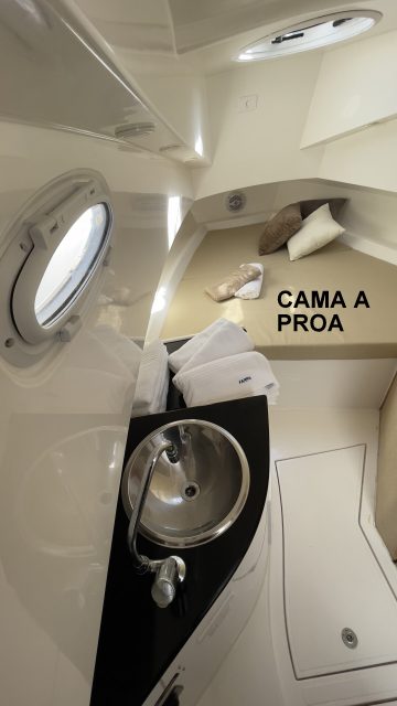 Uma cabine ainda maior, duas verdadeiras camas de casal, um banheiro amplo e bancada com pia e armários consentem pernoites ou descansos nas pescarias confortavelmente para quatro pessoas adultas.