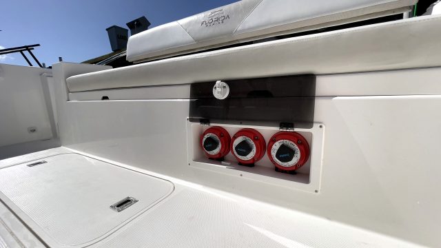 Já para os amantes de pesca, o espaço é amplo e com duas caixas de peixes no piso, viveiro na murada de popa e porta varas laterais.