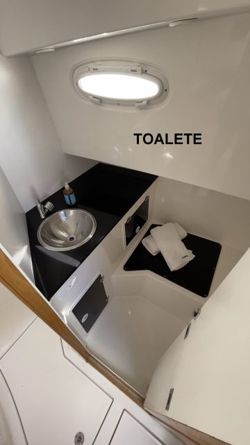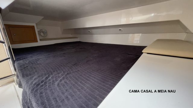 casal na proa com compartimento para guardar objetos a baixo do colchão, cama de casal a meia nau, pia completa com bancada a bombordo, armário em baixo da pia para guardar objetos, banheiro com porta em madeira com fechadura, pia com bancada, armário da pia com porta em acrílico e vigia elíptica.